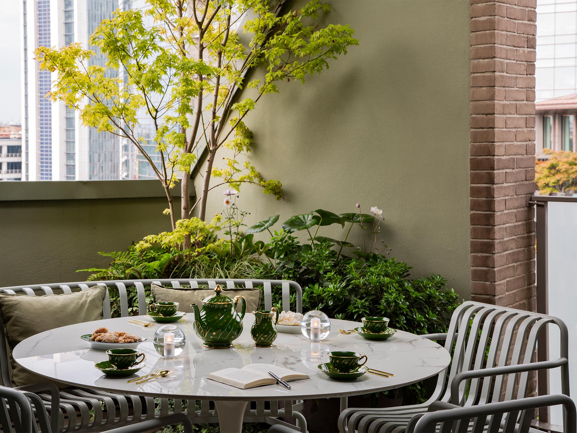 EN Nestled like a treasure chest on the ninth floor of a building designed by Cino Zucchi this space features unique openings, with irregular shapes, that reveal unexpected views of the most contemporary part of Milan. The terrace is adorned with sculptural clay pots in natural tones that host freely shaped specimens distinguished by their lightness and elegance. The trees stretch toward the sky, shaping the space and marking the passage of time as they change with the seasons.